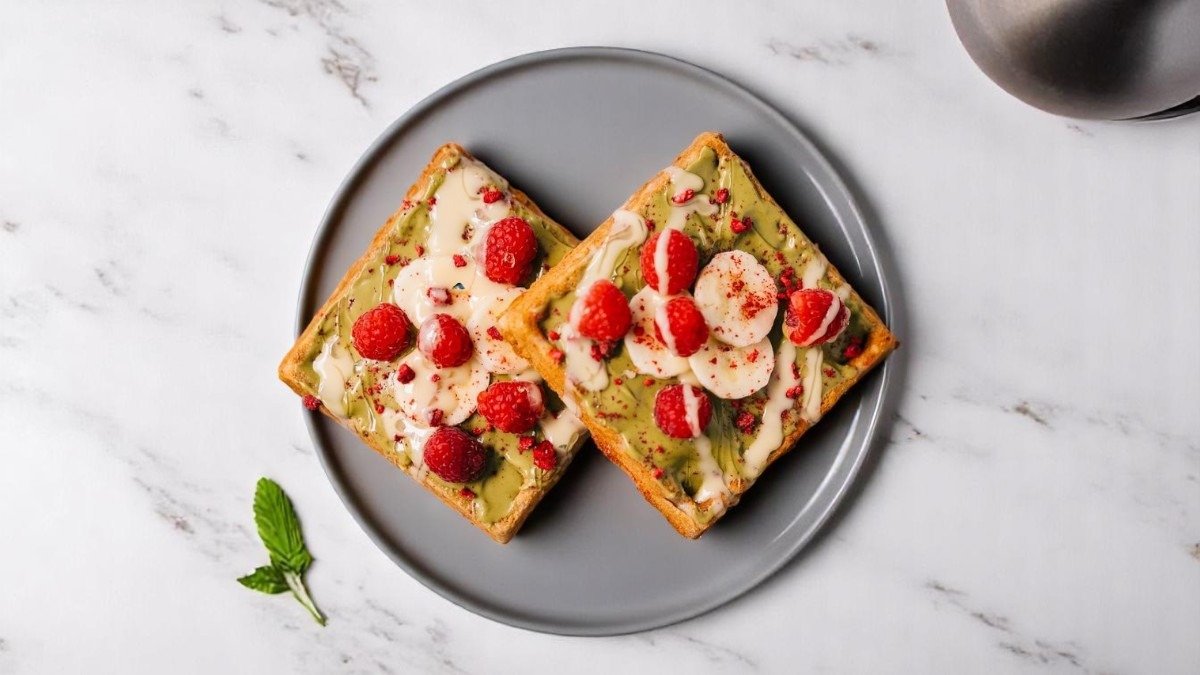 Pisztáciás vegán gofri fehércsokoládé öntettel és friss gyümölcsökkel