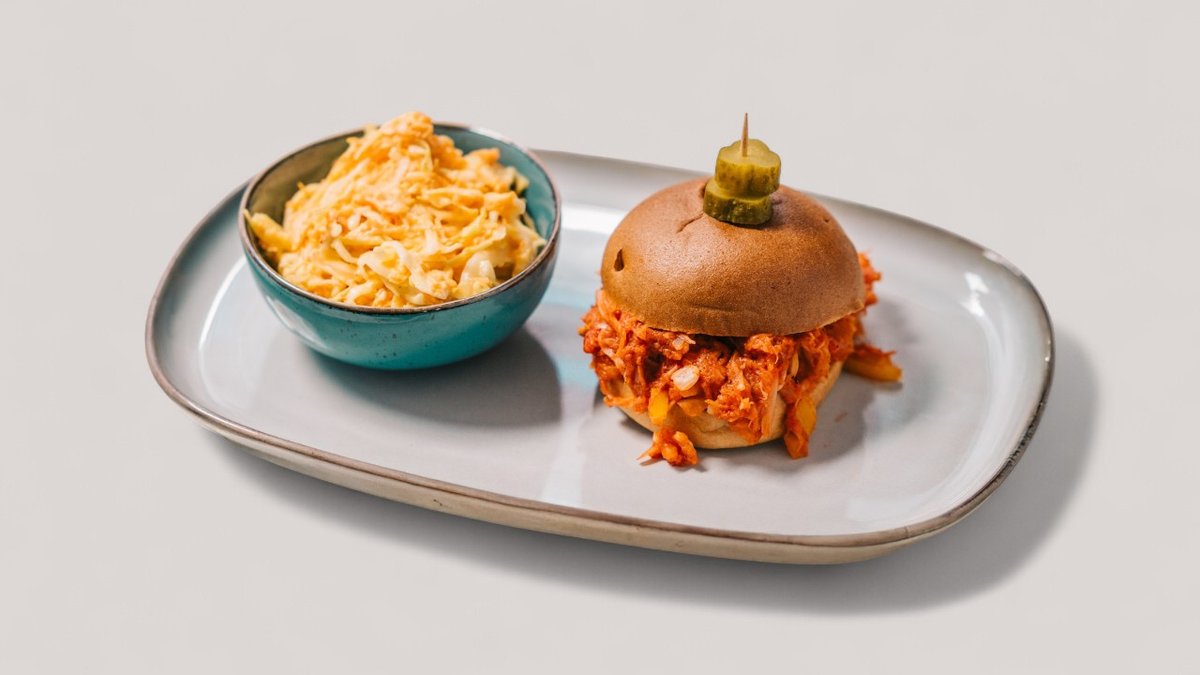 /gluténmentes hamburgerzsemle, jackfruit, vöröshagyma, fokhagyma, kalifornia paprika, sűrített paradicsom, paradicsom püré, vegán Worcestershire szósz, füstölt paprika, olívaolaj, coleslaw: répa, káposzta, vöröshagyma, veganéz, vegaföl, növényi tej, porcukor, almaecet, citromlé/