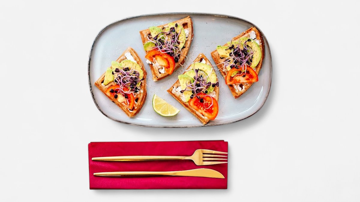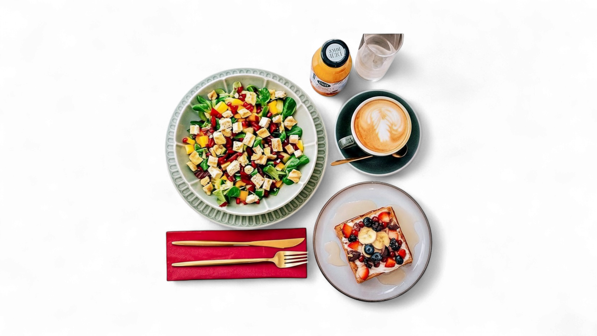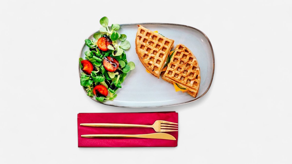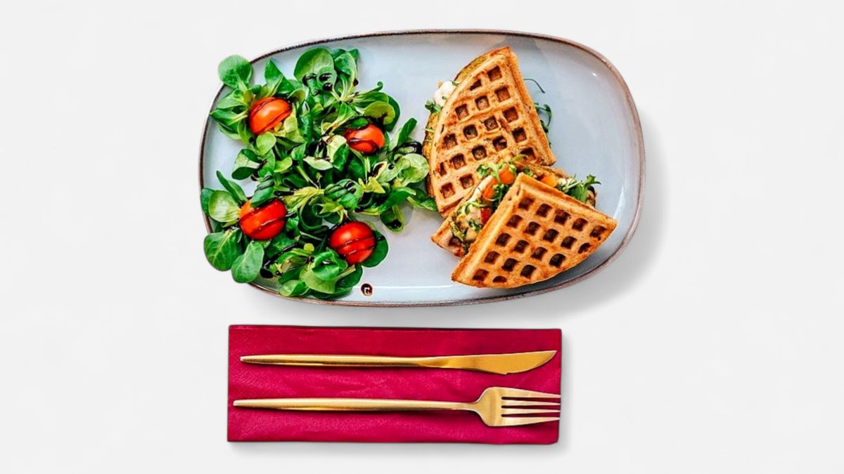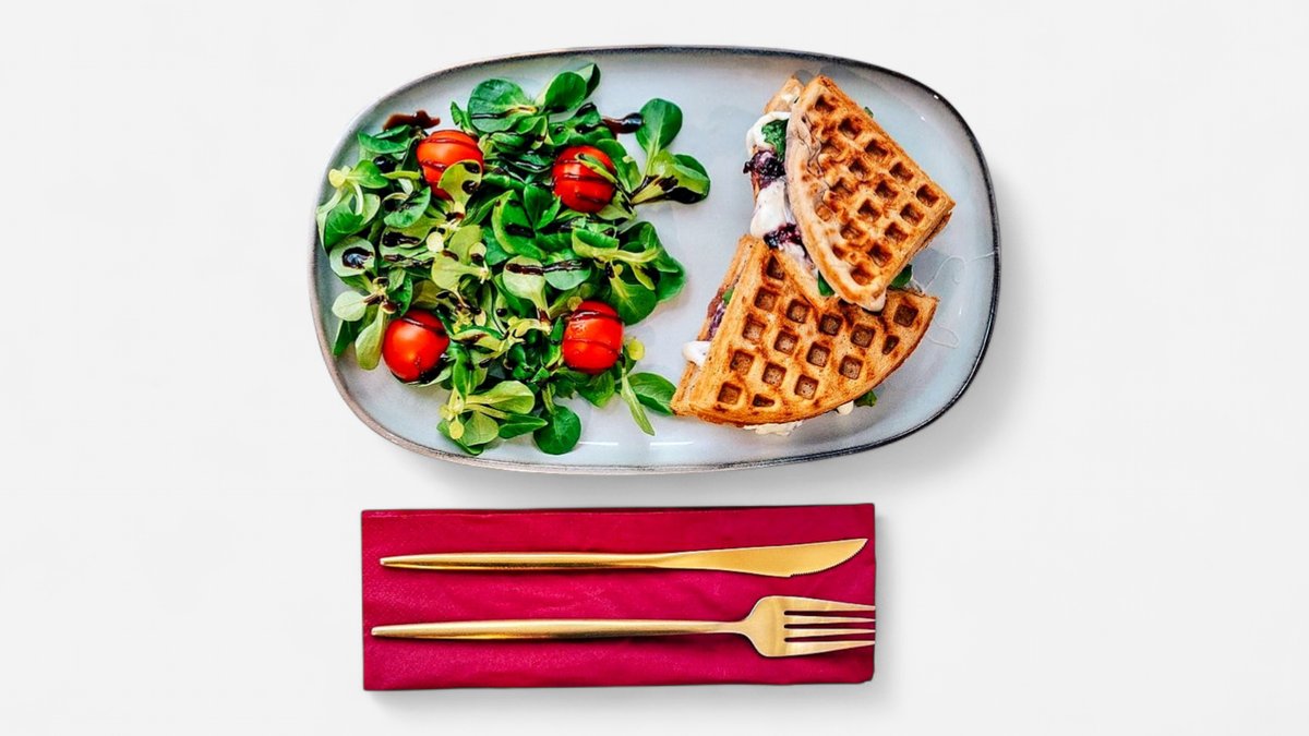 1 db választható saláta tál, 1 db választható édes/sós gofri (fél adag), 1 db választható gyümölcsital