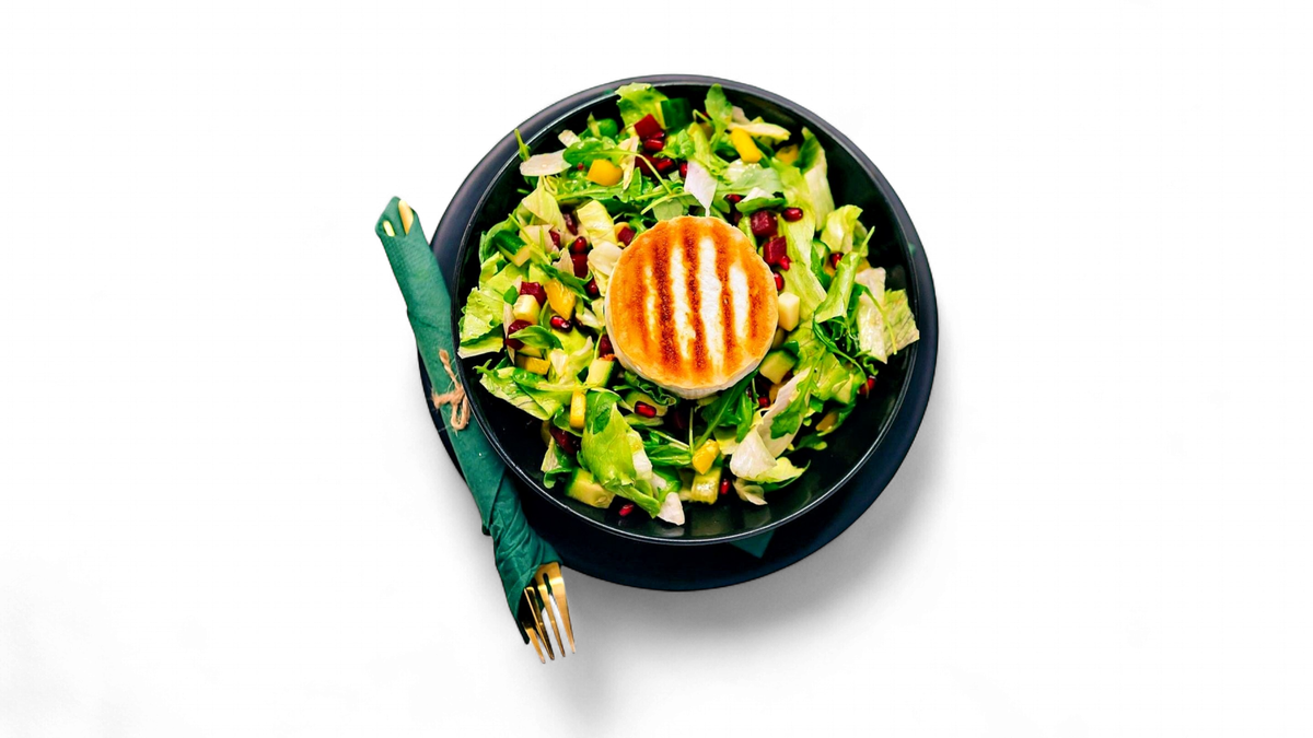 grillezett kecskesajt, jégsaláta, rukkola, kaliforniai paprika, gránátalma magok, cékla, uborka, agavé öntet
