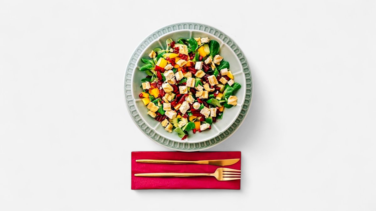 grillezett tofu, jégsaláta, madársaláta, kaliforniai paprika, gránátalma magok, cékla, uborka, agavé öntet