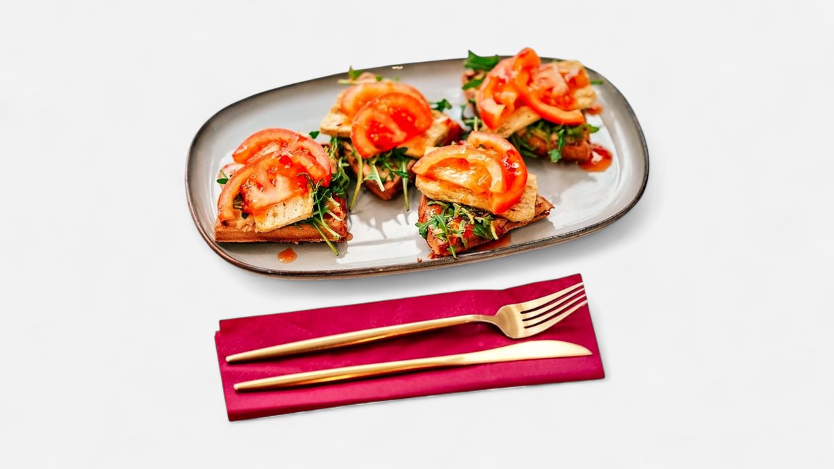 házi humusz, füstölt tofu, rukkola, paradicsom, édes chili szósz