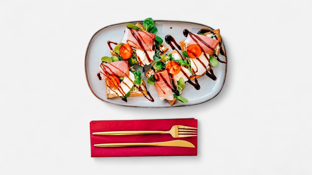 sajtkrém, fekete erdei sonka, mozzarella sajt, madársaláta, koktélparadicsom, balzsamecet