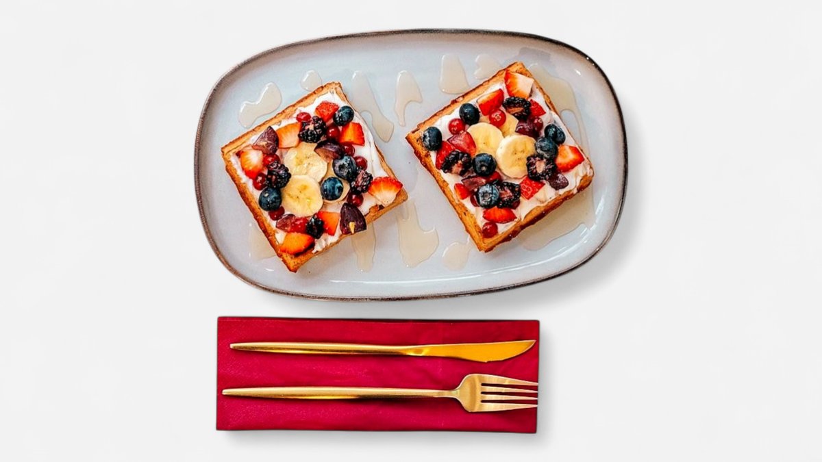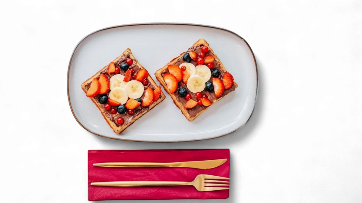 mogyoróvaj, friss szezonális gyümölcsök, agavé szirup