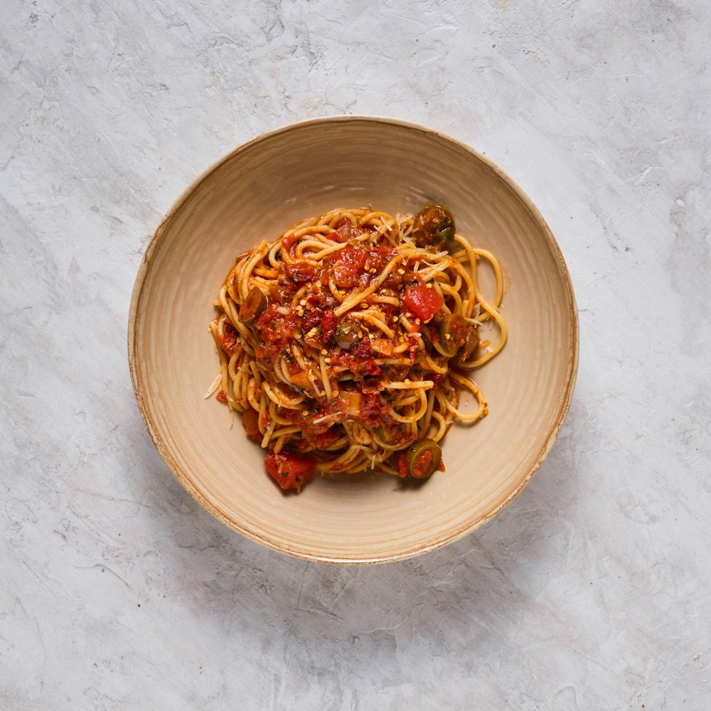 csípős-olívás paradicsomszószban, parmezán sajttal (Kérlek, válassz hozzá tésztafajtát!)