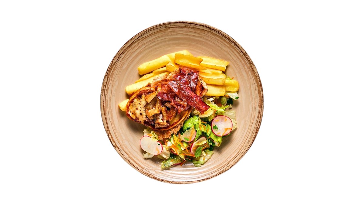grillezett csirkemell, bacon, füstölt mozzarella sajt, friss saláta, hasábburgonya (Kérlek, válassz hozzá salátaöntetet!)