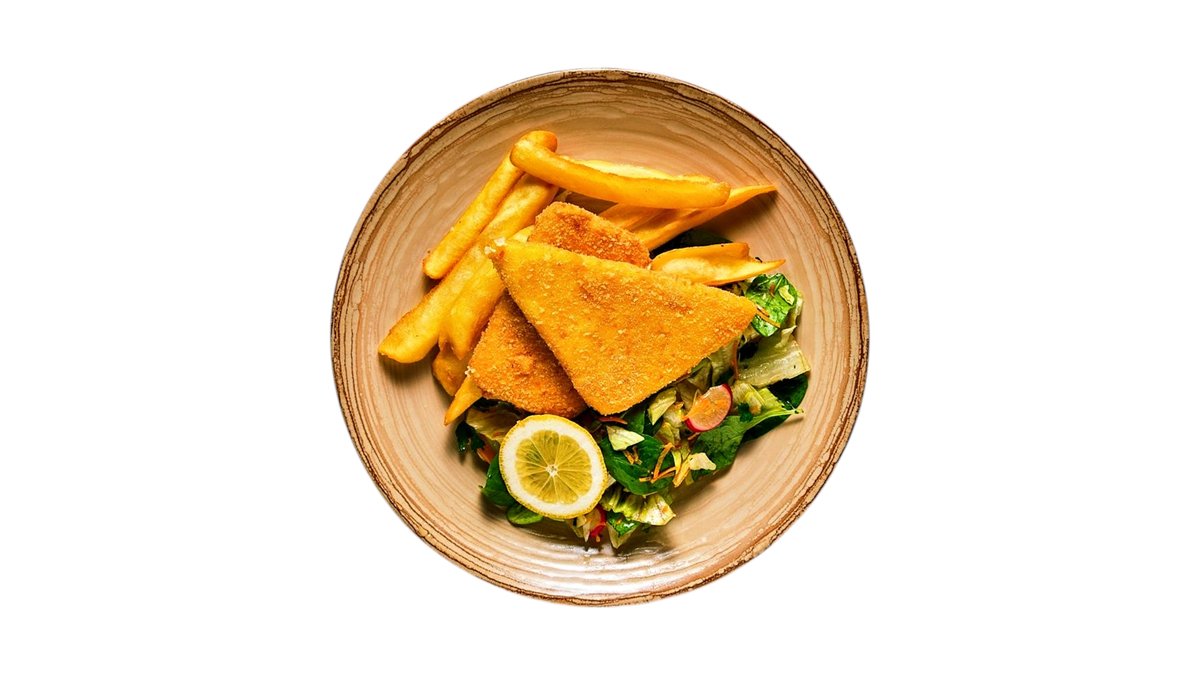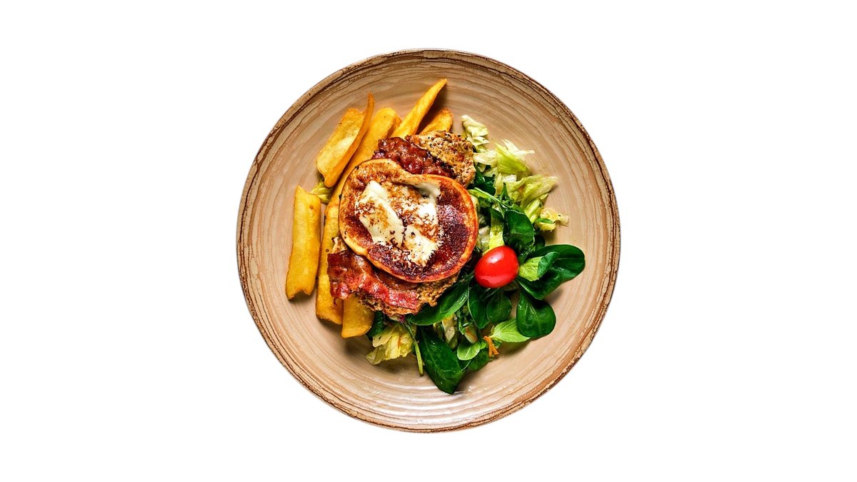 cukkinivel, szárított sonkával, parmezán sajttal, friss salátával, hasábburgonyával (Kérlek, válassz hozzá salátaöntetet!)