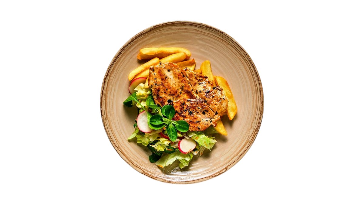 bazsalikomos olívaolajos pácban, friss saláta, hasábburgonya (Kérlek, válassz hozzá salátaöntetet!)
