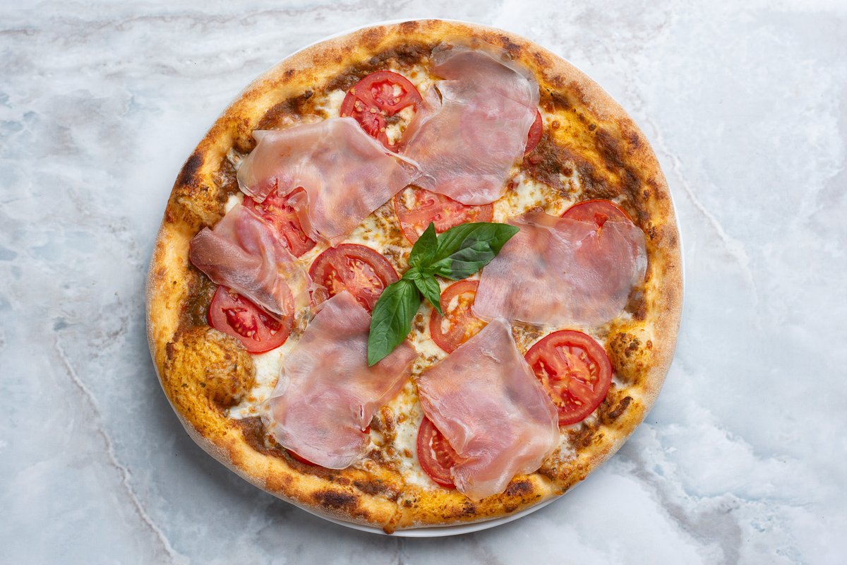 pizzaszósz, mozzarella, szárított sonka, rukkola, parmezán