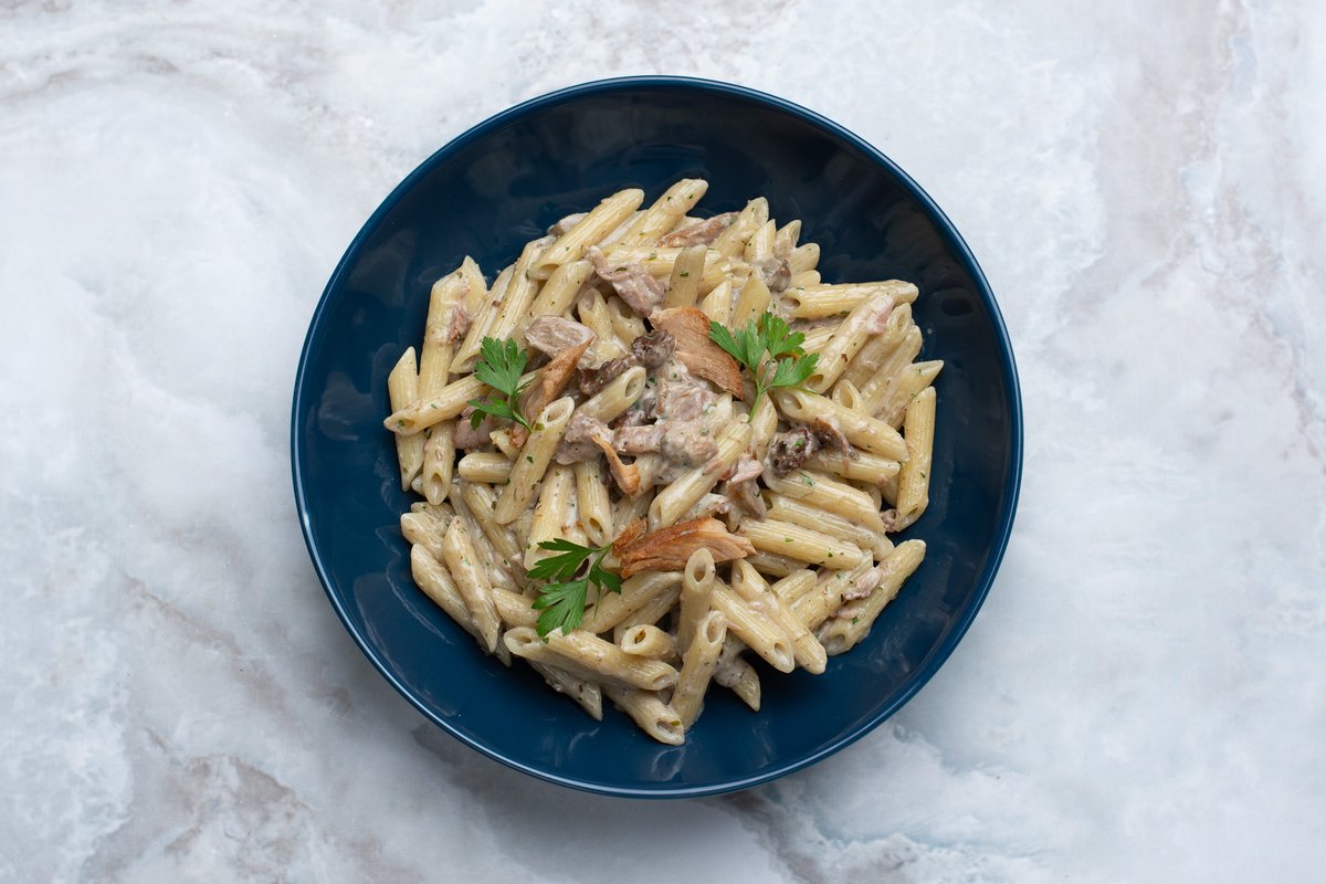 tépett tarjás, tejszínes-gombás szószban, petrezselyemmel, parmezánnal (Kérlek, válassz hozzá tésztafajtát!)