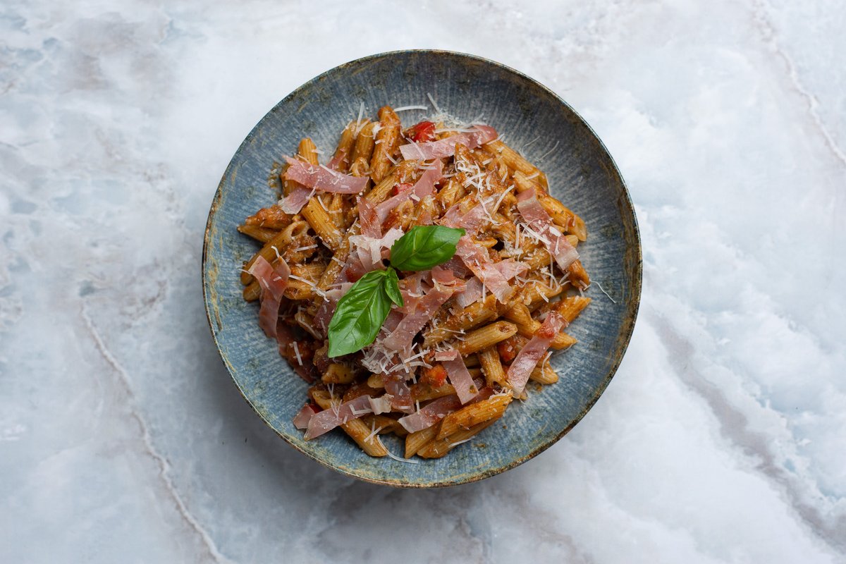 vörös pestos szószban, paradicsommal, szárított sonkával, parmezánnal (Kérlek, válassz hozzá tésztafajtát!)