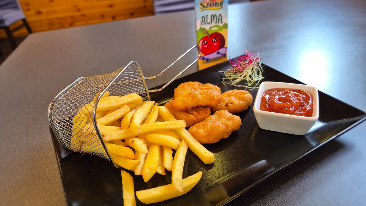 Includes:chicken breast strips, side dish, ketchup, 0.2L Szobi soft drink. Tartalmaz: csirkemellcsíkokat, köretet, ketchupot, 0.2l szobi üdítőitalt. Kérjük jelezze, hogy milyen üdítőt és köretet szeretne.