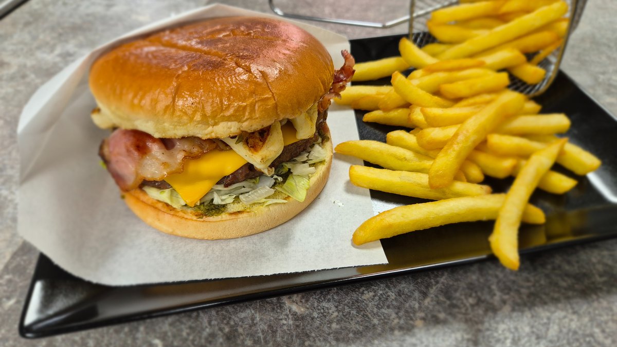 Peszto, Jégsaláta, Marhahúspogácsa, Cheedar sajt, Grill sajt, Sült bacon, Sült hagyma, Paradicsom