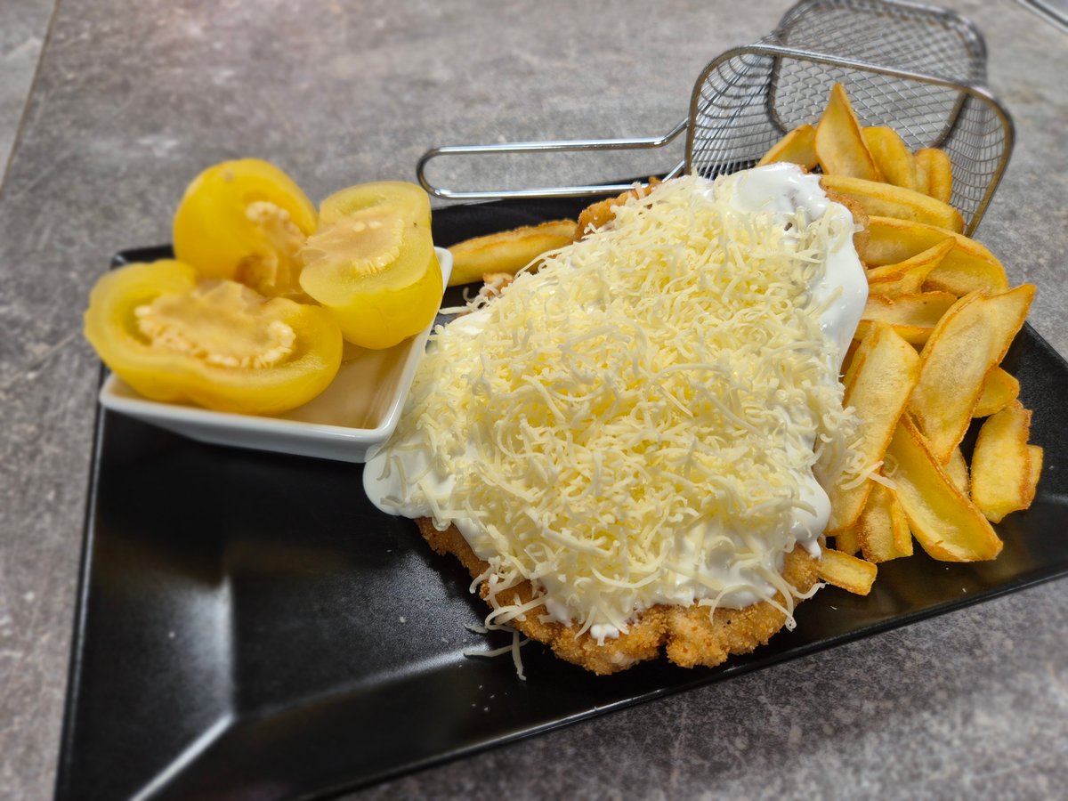 Rántott csirkemell fokhagymás tejfölös szósszal és sajtszórással Az ár nem tartalmazza a köretet és az almapaprikát.