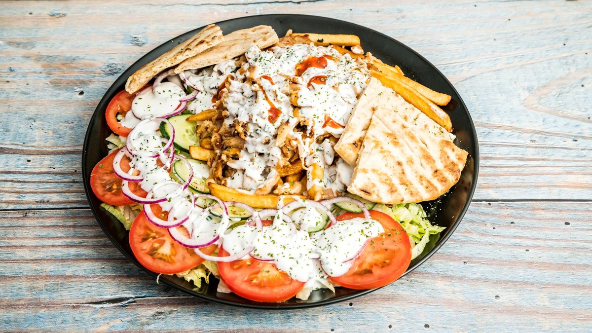 Gyroshús vagy falafel amit választasz, hagyma, paradicsom, uborka, fokhagymás görög joghurt öntet, csípős szósz Hasábburgonyával A kép illusztráció