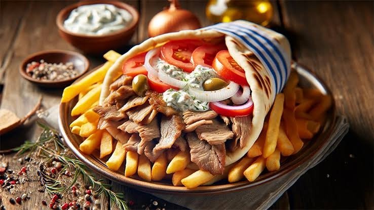 gyroshús vagy falafel amit választasz, paradicsom, lila hagyma, tzatziki, , fetakrém Hasábburgonyával A kép illusztráció