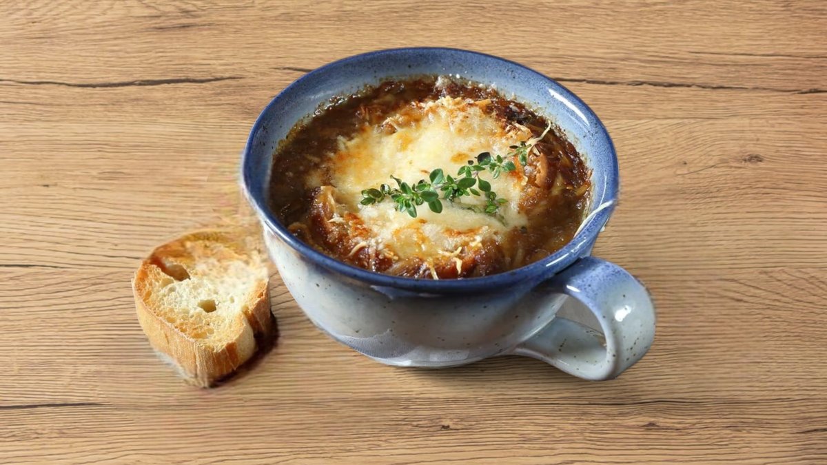 Egy tartalmas, lassan főtt francia hagymaleves, gazdag karamellizált hagymával, illatos kakukkfűvel és ropogós, sajttal borított pirítóssal a tetején.