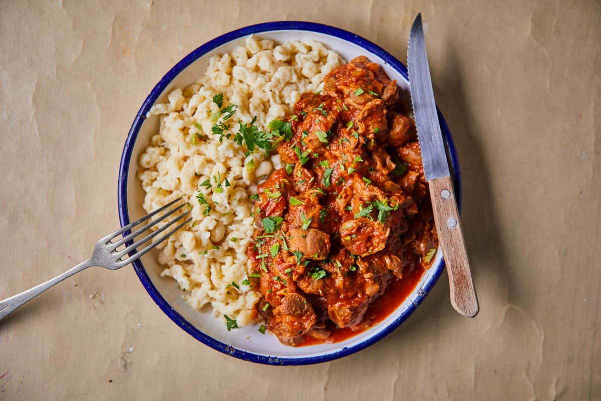 Lassú tűzön főtt, sűrű szaftos marhapörkölt prémium minőségű marhahúsból, házi galuskával tálalva. Tejföllel is kérheted, savanyúságnak pedig csemege uborka választható mellé!