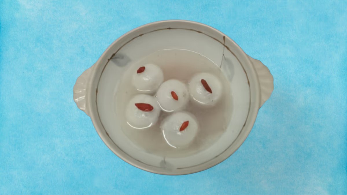 5db ragacsos rizslisztből készült golyók, valaszthato töltelékkel töltve. Meleg, enyhén édes levesben tálalják, különleges állagú desszert.