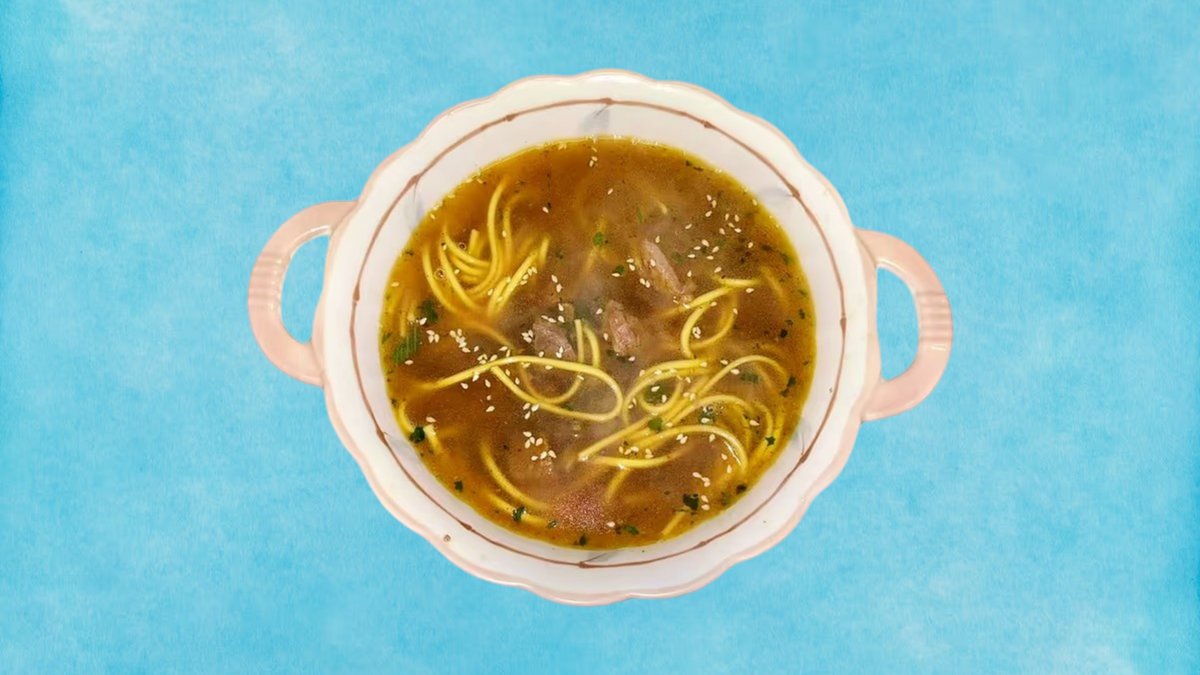 Aranyló szecsuáni marhaleves, különleges fűszerekkel. Rugalmas szecsuani tésztával és omlós marhahússal tálalva.
