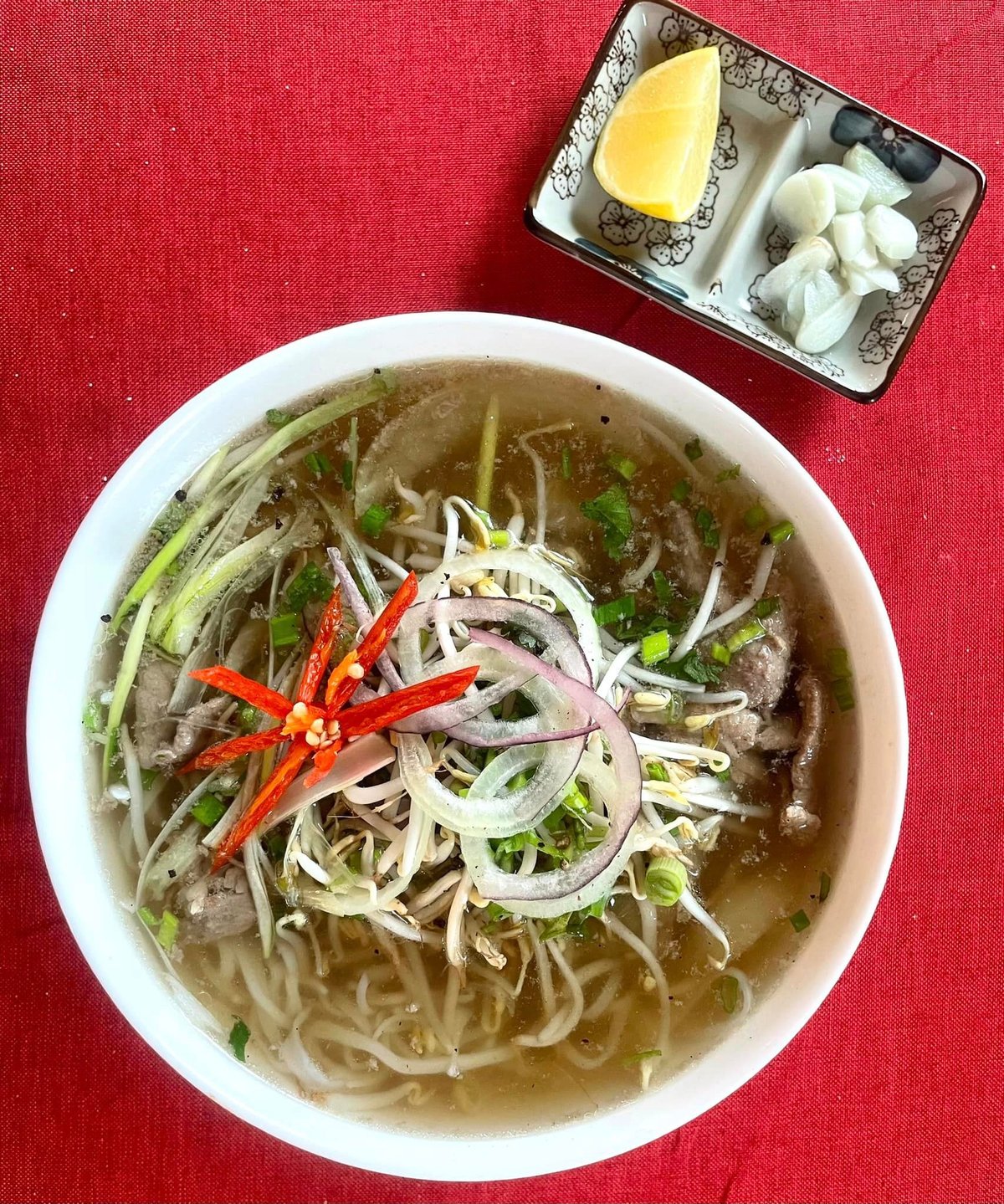 Pirított marhahús, csontleves, vietnámi fűszerek, bazsalikom, hagyma, rizstészta