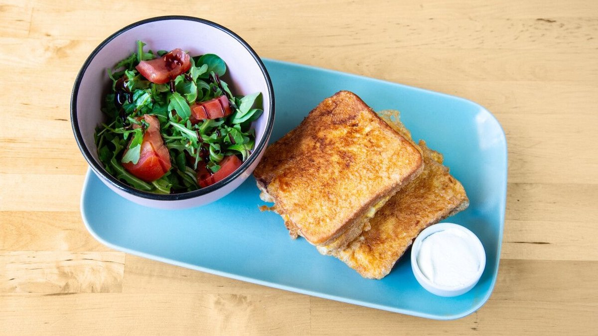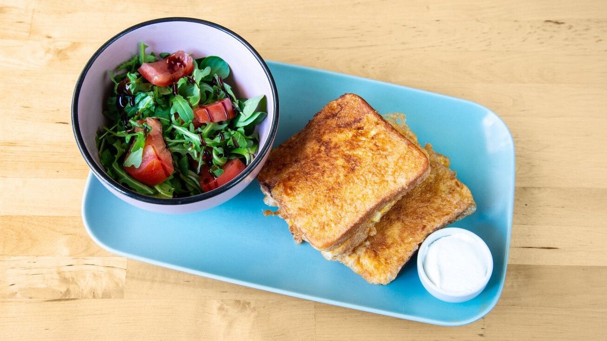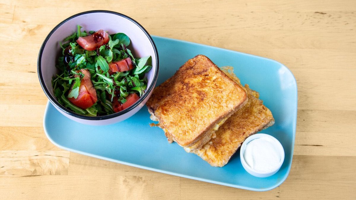 2x2 szelet toastkenyér közé töltött főtt sonka és mozzarella bebundázva, kisütve , tejföl, kis adag paradicsomos zöldsaláta