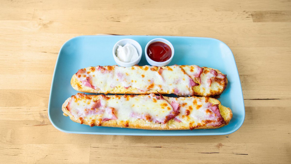 Kettévágott francia félbagett főtt sonka és mozzarella feltéttel