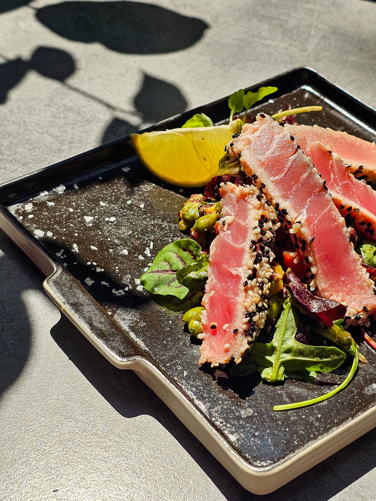 Vöröstonhal szezámmaggal sütve szojababos avokádós fekete rizses salátával