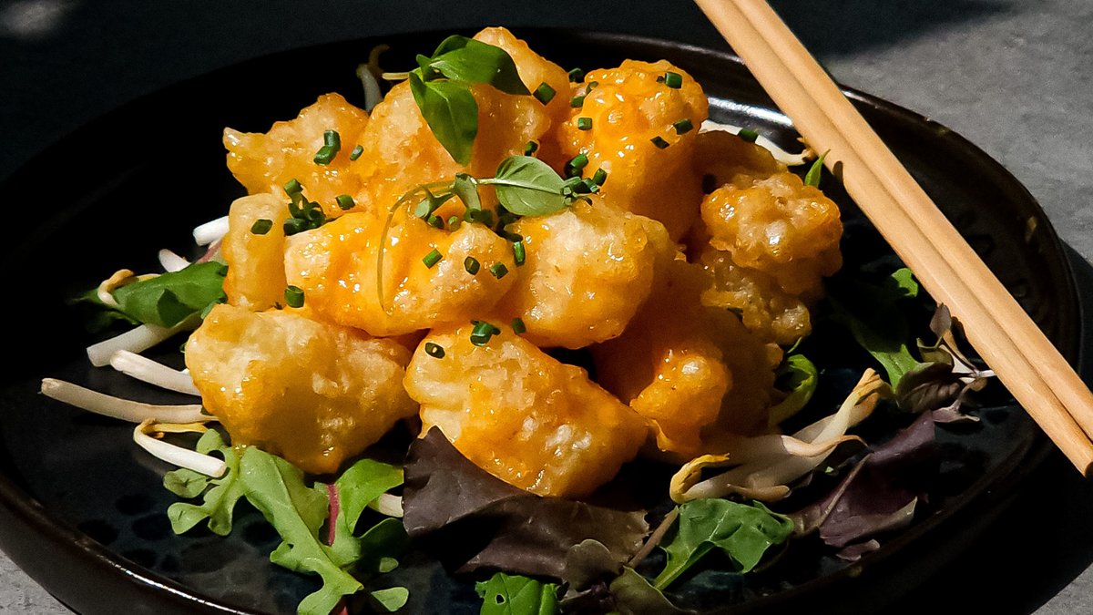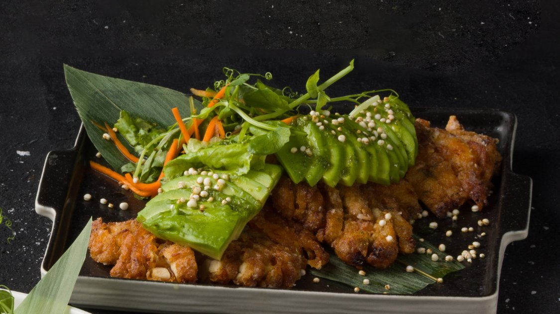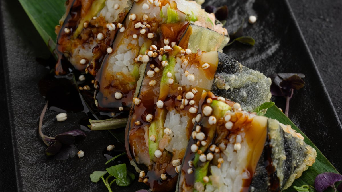 Tempurában sült lazac,sajt és avokádó, édes szójaszósz, puffasztott quinoa