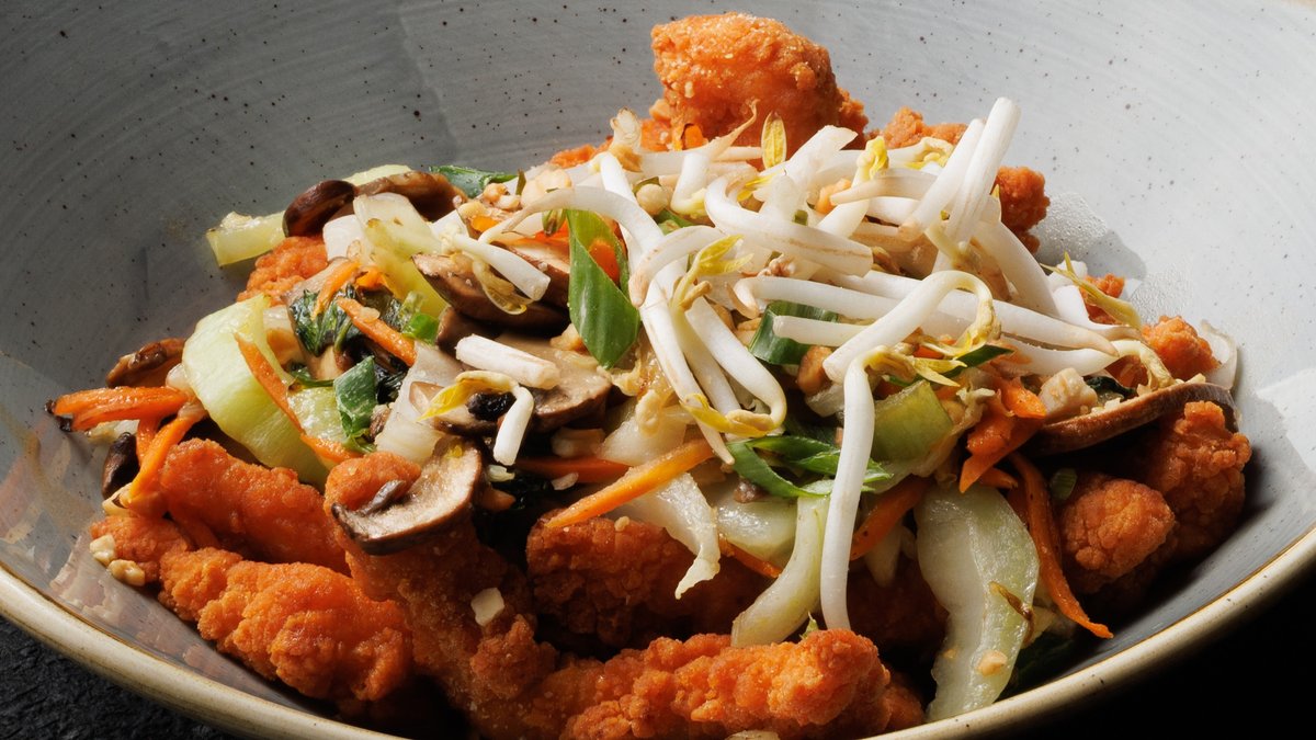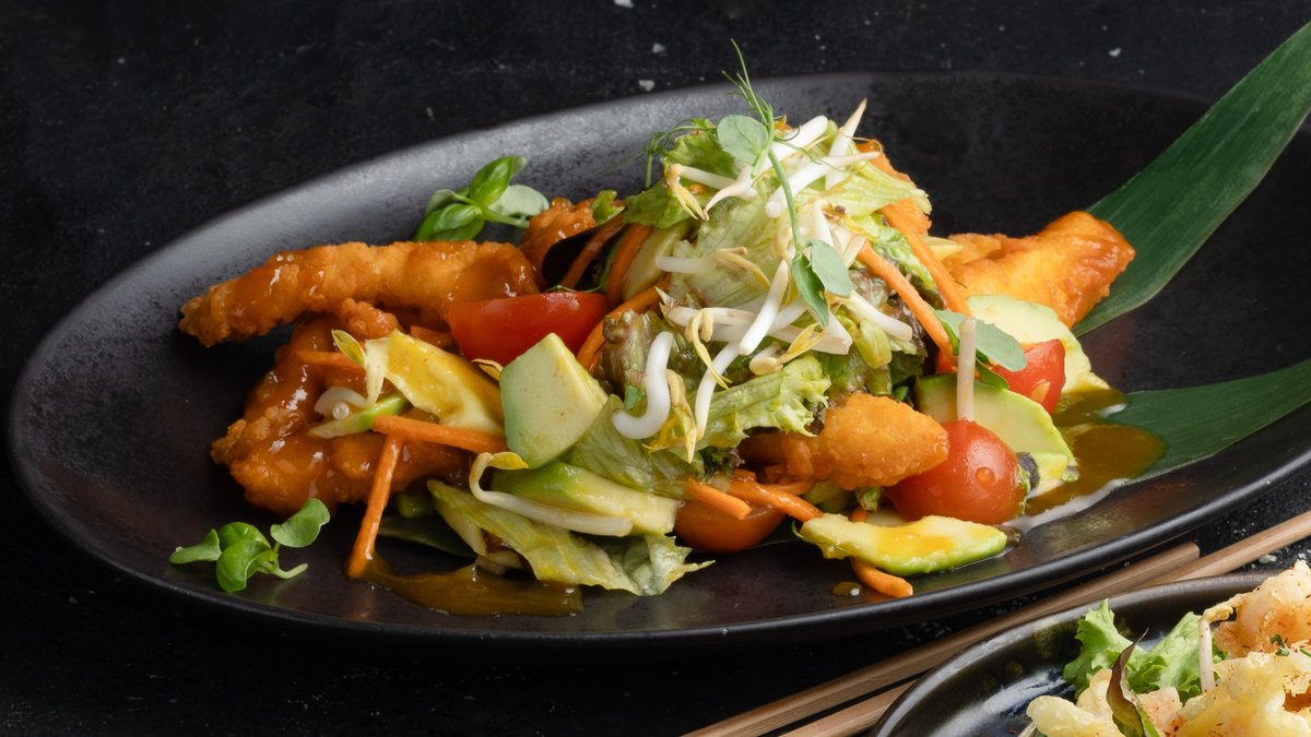 5 fűszeres sült kacsacomb , avokádó, snidling, saláta, uborka borítás , puffasztott quinoa, narancsos teriyaki