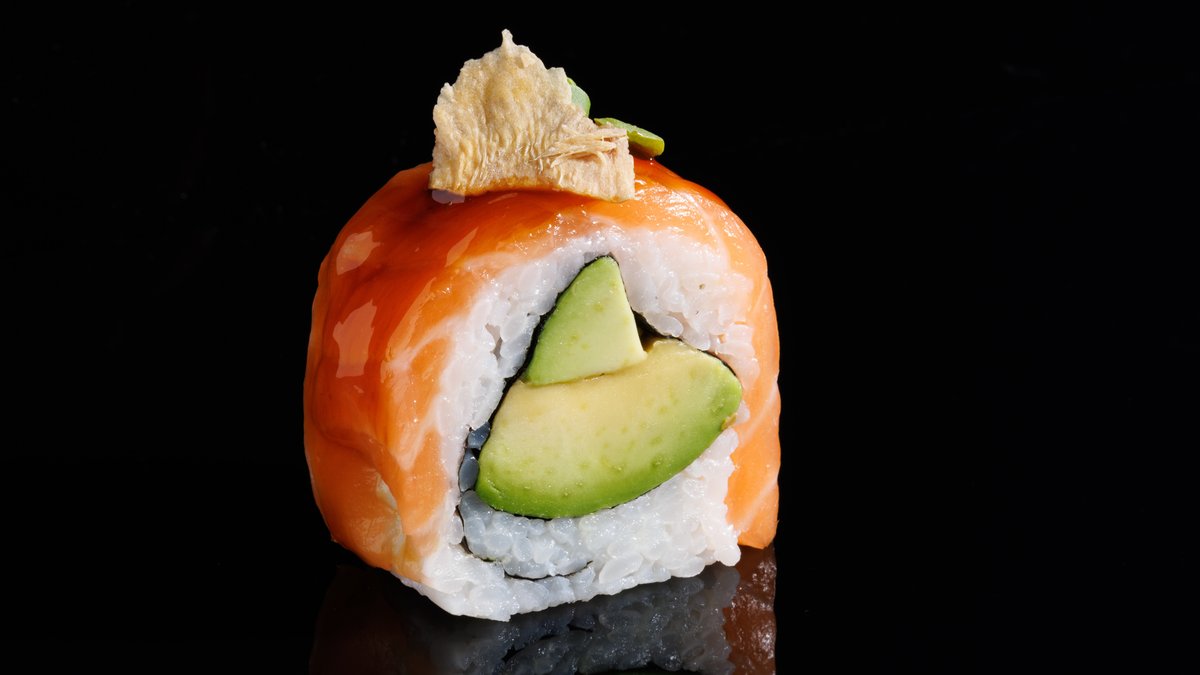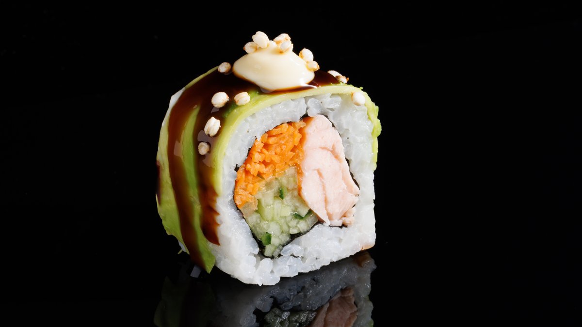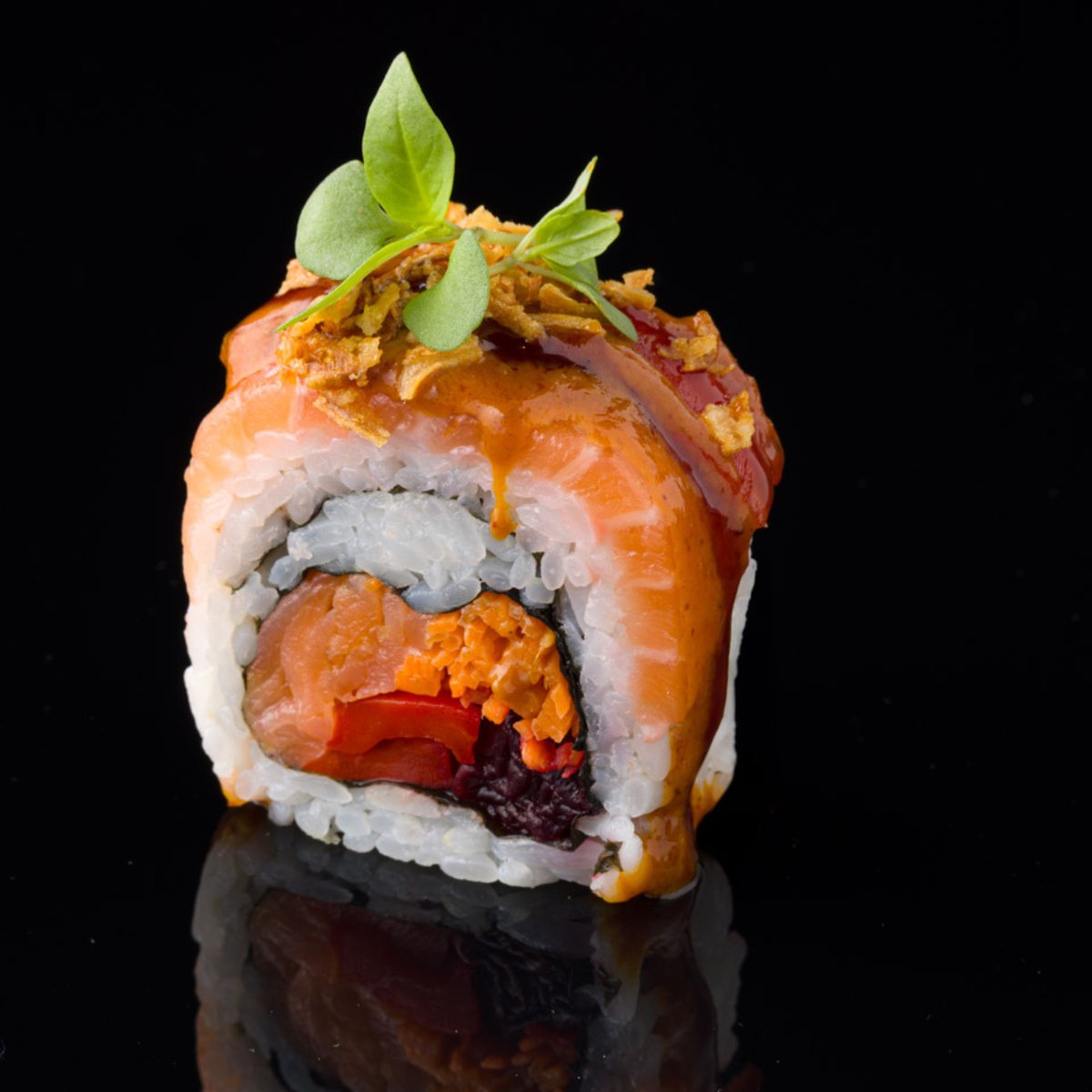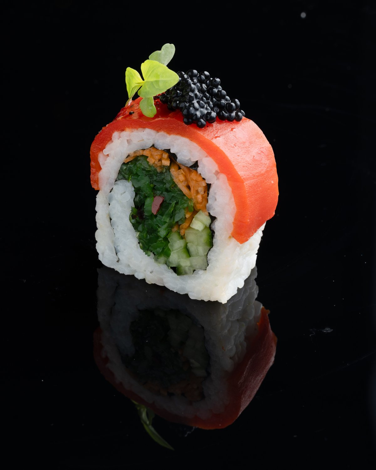 lazac, avokádó, uborka, sült cékla , perzselt lazac borítás, lazackaviár, teriyaki