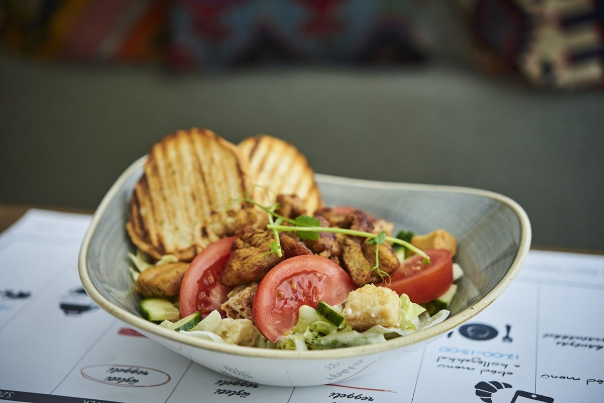 bészíncsíkok, rukkolasaláta, humusz, padlizsánkrém és pita