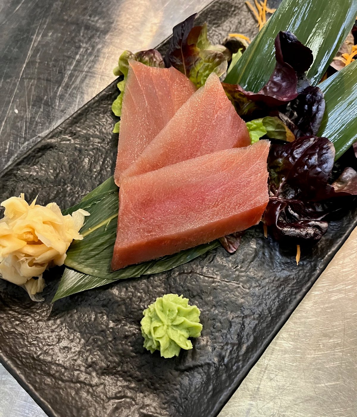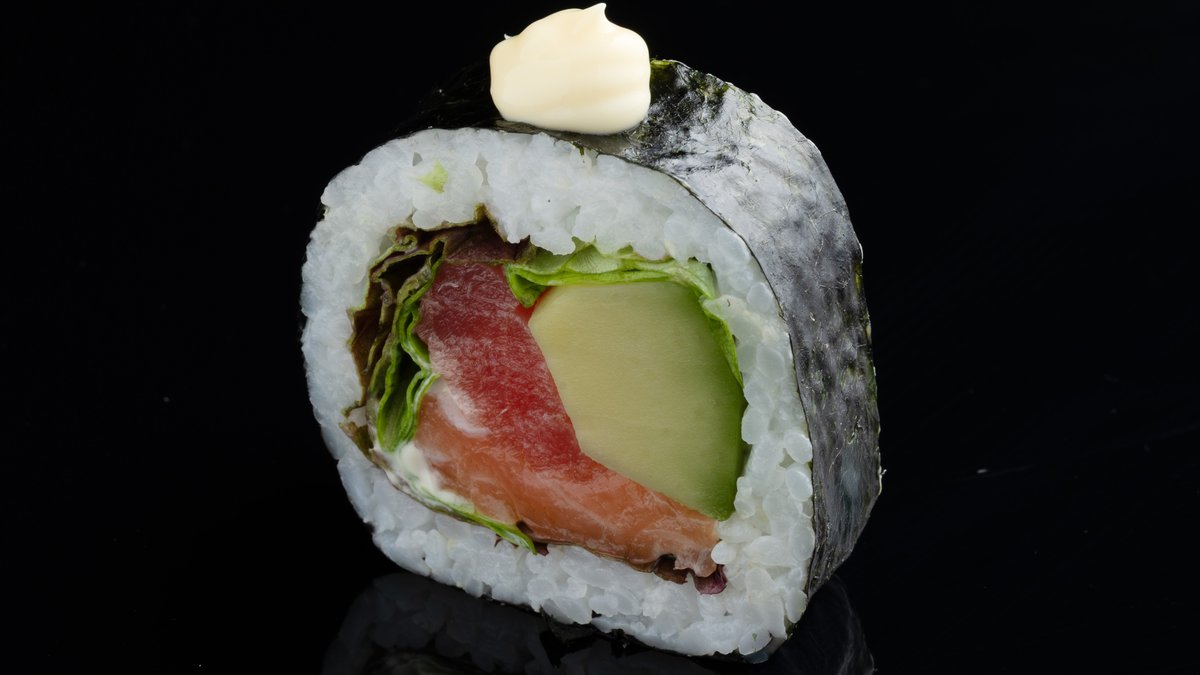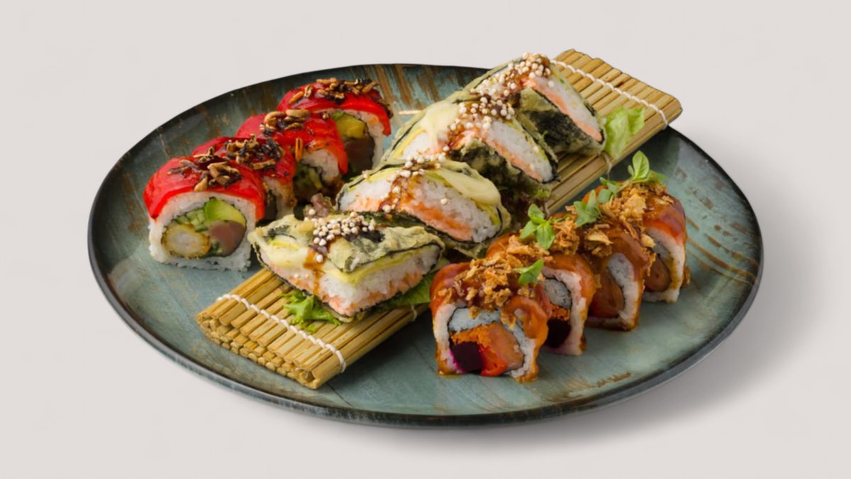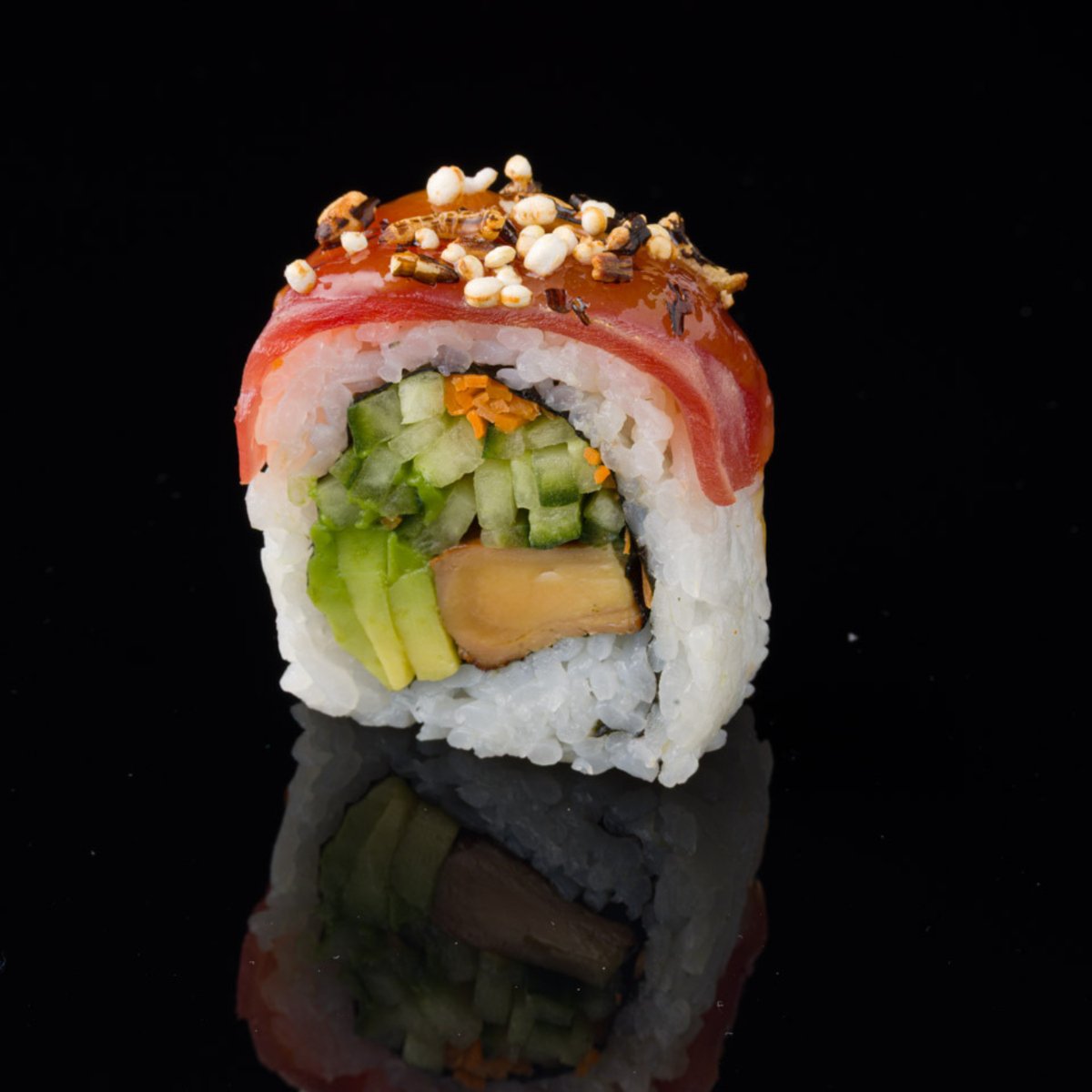 Tonhal, lazac , rák tempura, uborka , répa, avokádó , chili szósz, teriyaki , mizuna