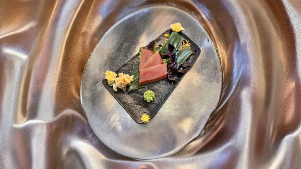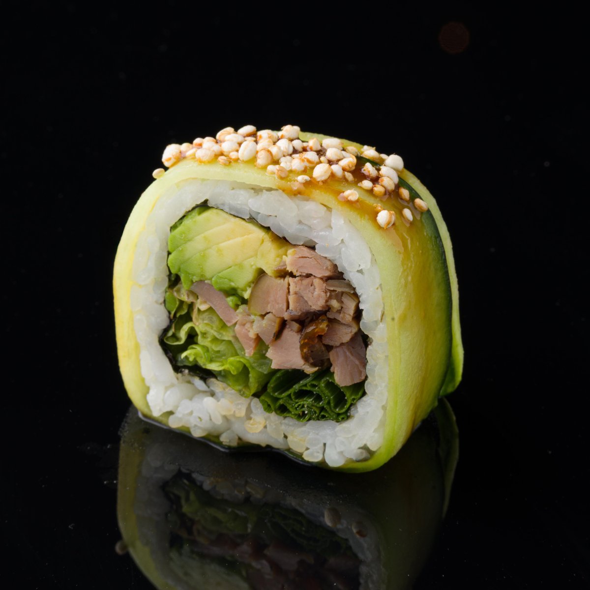 sült libamáj, avokádó, uborka, répa, tonhal borítás, mangó chutney , puffasztott vadrizs, teriyaki