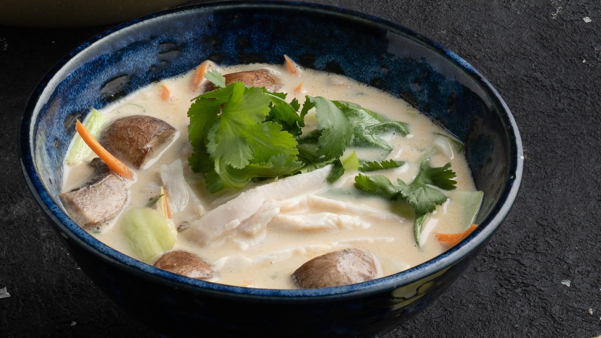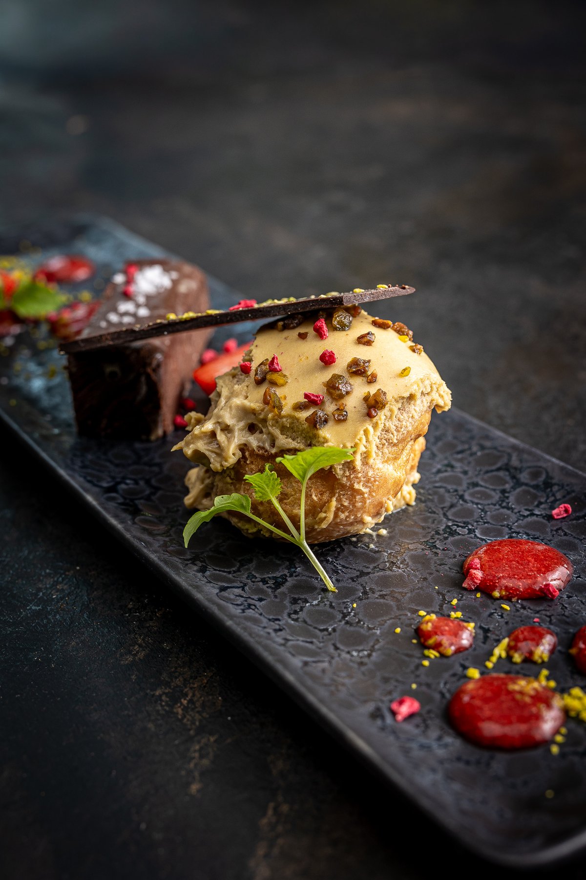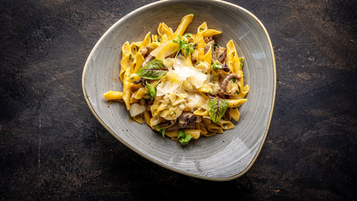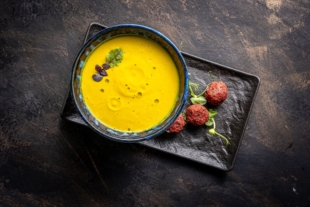 Erdei gombakrémleves, szarvasgombás-sajtkrémes bruschettával és feketeerdő sonkával