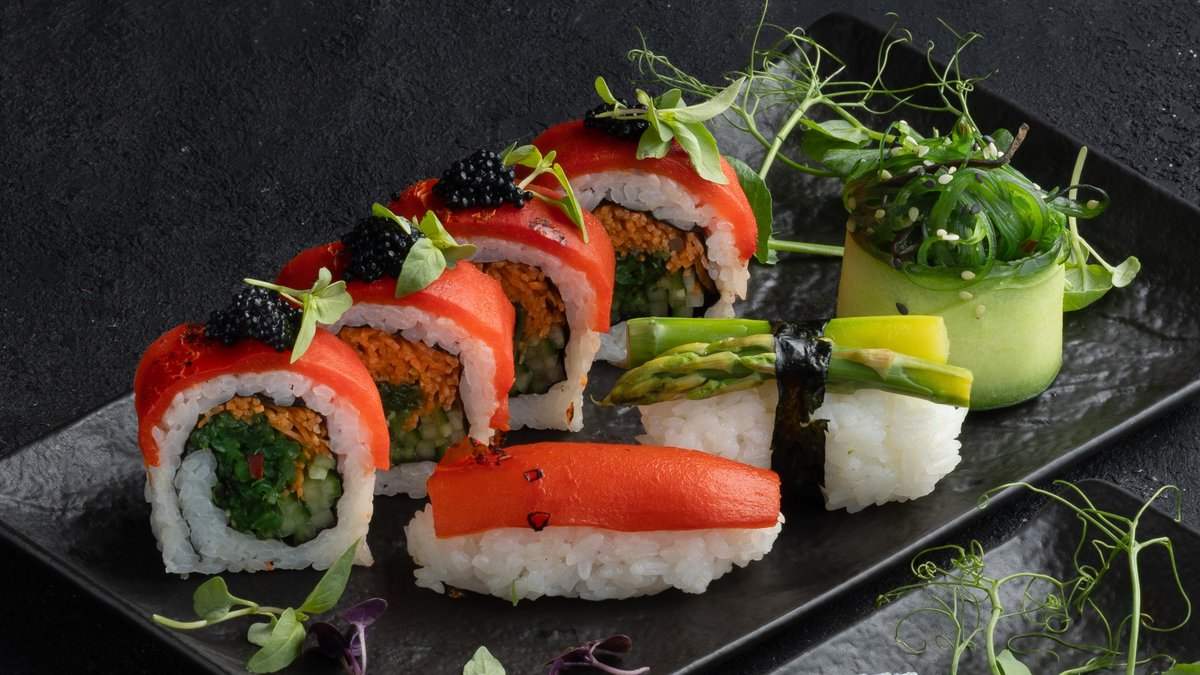 Yasai Truffle Uramaki 4 db, Sült paprika nigiri 1 db, zöldspárga nigiri 1 db, Wakame saláta gunkan 1 db