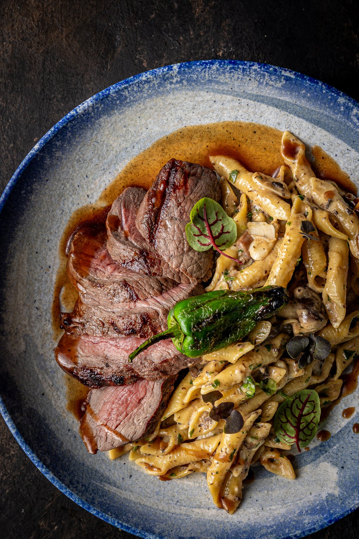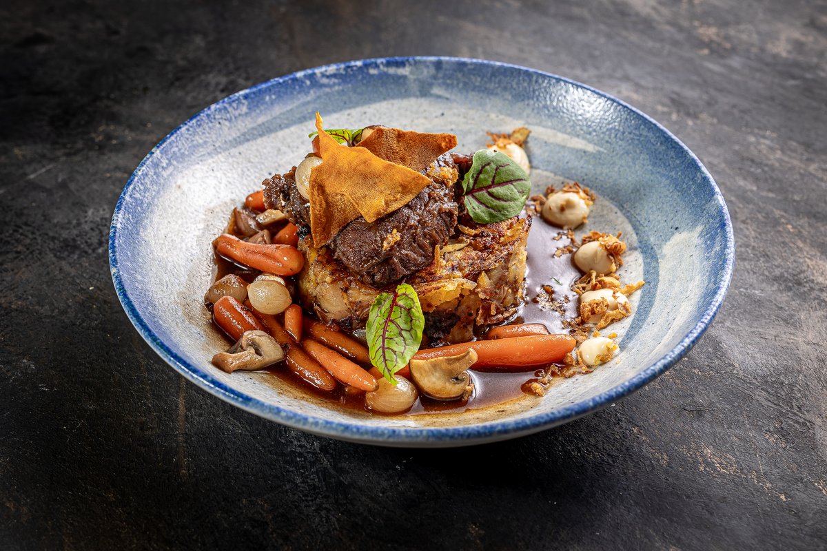 Marhapofa zöldséges vörösboros galace-szal , smashed burgonyával , karamellizált hagymás aiolival