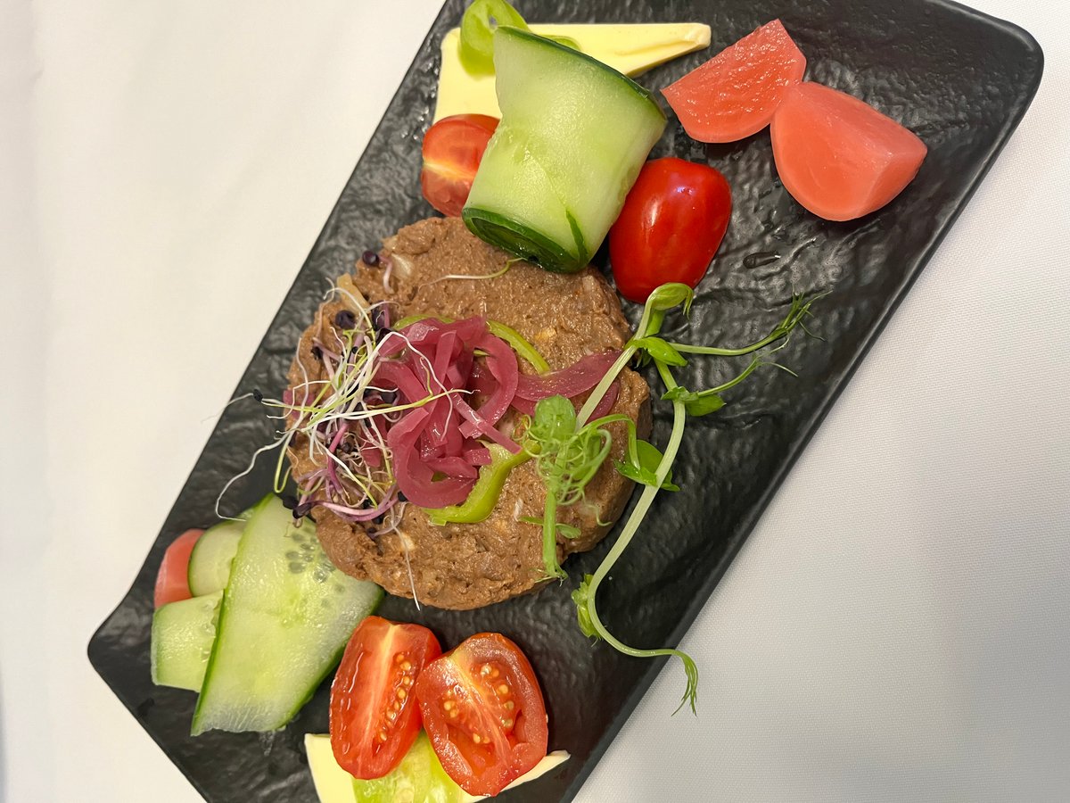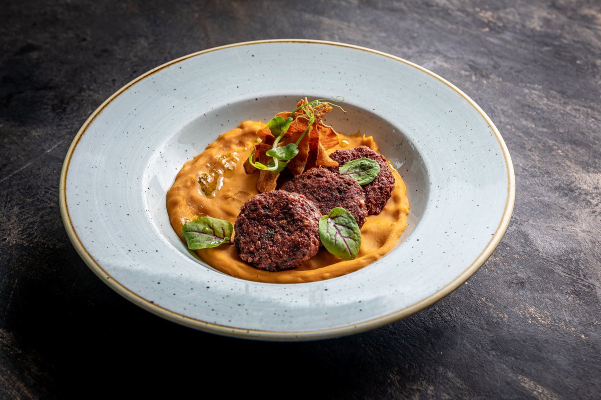 Céklás csicseriborsó fasírt vöröslencse-pürével és édesburgonya chipszel