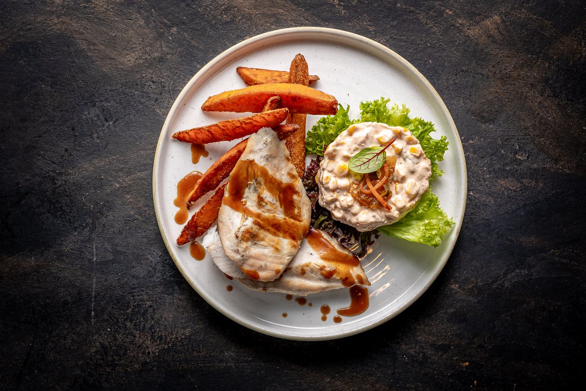 Faszénen sült csirkemell kimchis-majonézes kukoricasalátával és édesburgonyával