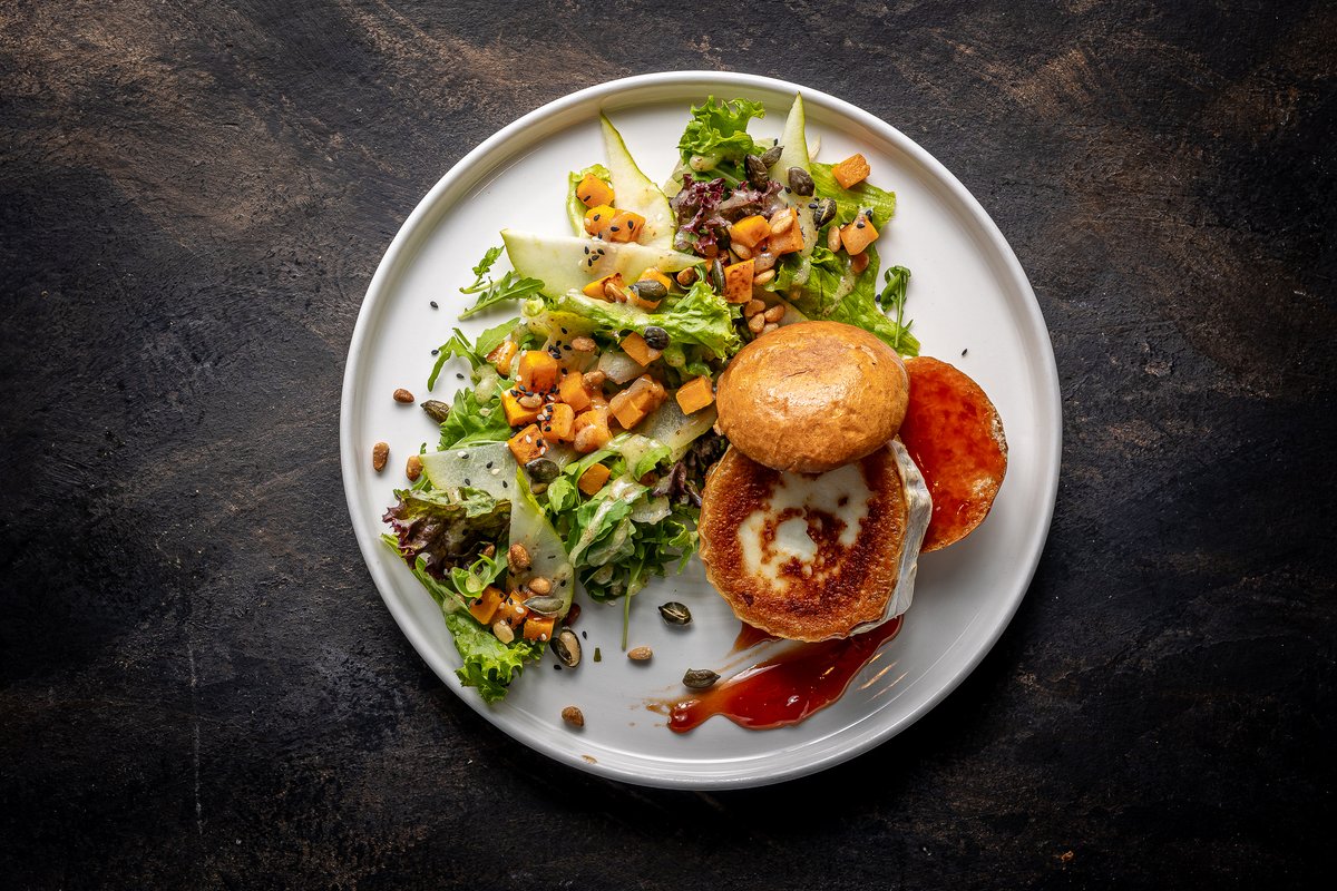 Grillezett kecskesajt körtés-sütőtökös salátával, csipkebogyólekváros mini brióssal és pirított magvakkal