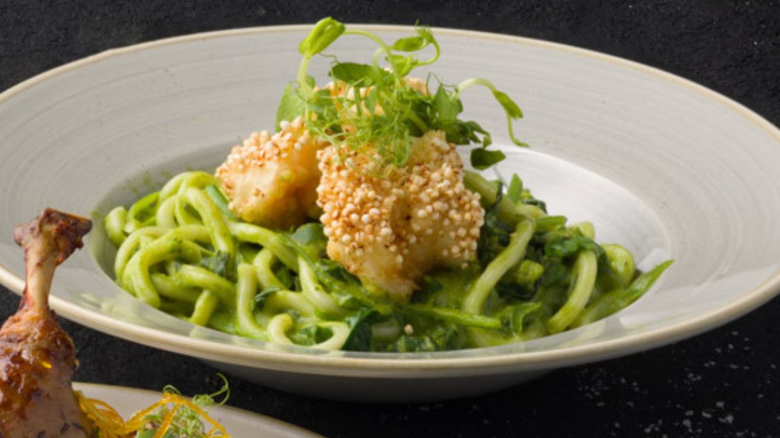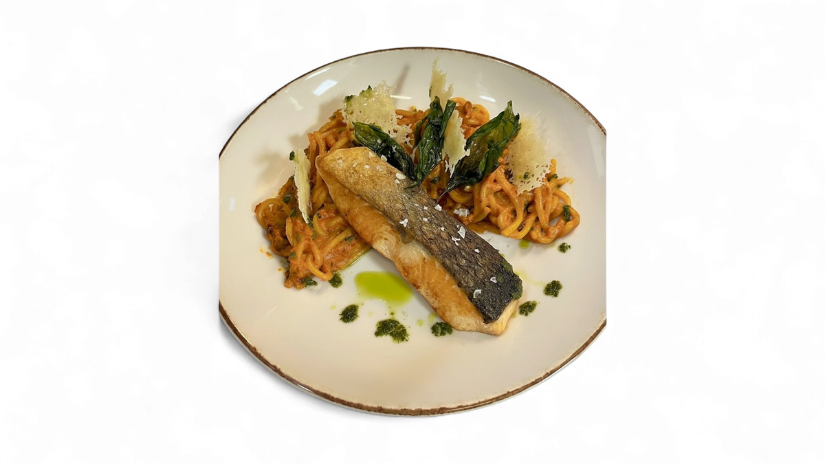 Lazac steak bazsalikomos - aszalt paradicsomos mascarponés spagettivel és pecorino ropogóssal