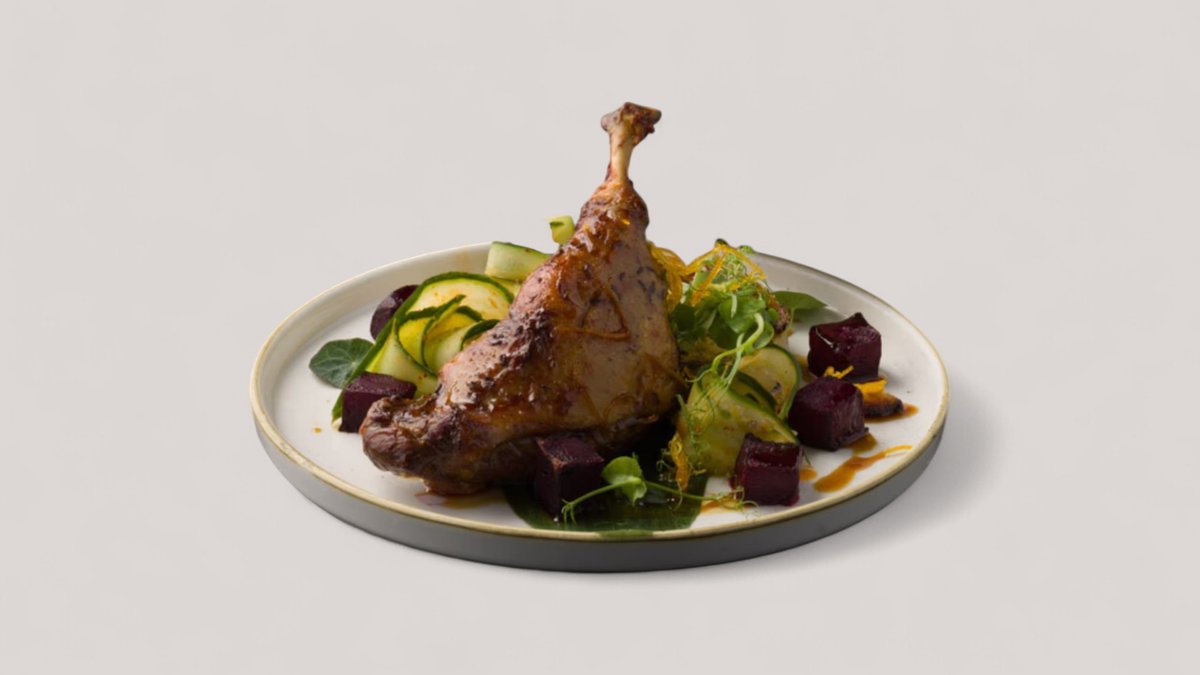 Ötfűszeres narancsos konfitált kacsacomb faszénen sült céklával , édesburgonyával és kimchis uborkával