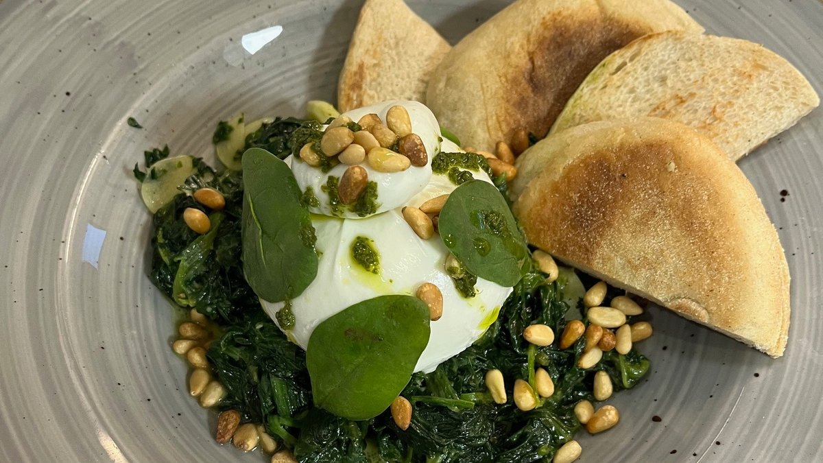 Fokhagymás spenót pirított fenyőmaggal, burratával és english muffinnal