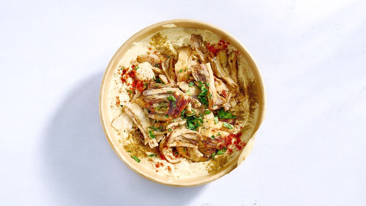 Házi hummuszkrém csirke vagy borjúhússal, olíva olajjal, 1 db klasszikus pitával.