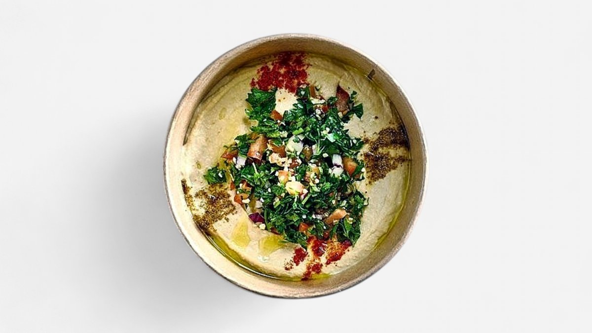 Házi hummuszkrém Tabbouleh salátával és olívaolajjal. Frissen készített petrezselyem saláta, bulgurral, paradicsommal,mentával, citrommal, klasszikus pitával.