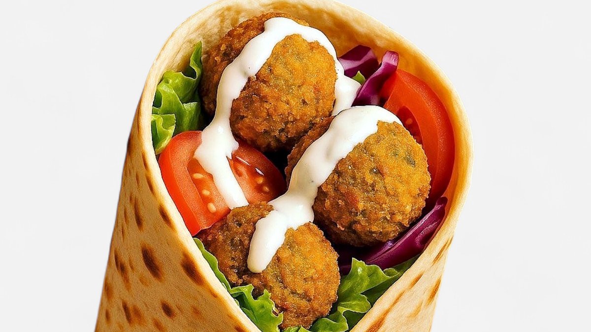 Falafel Shawarma Szendvics 🌱 (vegan) tortilla 25cm, 2 db falafel csicseriborsó fasírt, jégsaláta, paradicsom, hagyma. Shawarma szósz Falafel Shawarma Sandwich 🌱 (vegan) (falafel balls, lettuce tomato, onion, shawarma sauce)