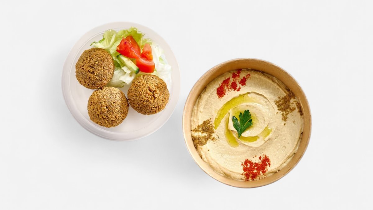 Házi hummuszkrém , 3 db falafel fasírttal, olíva olajjal, 1 db klasszikus pitával.