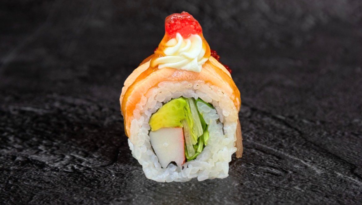 Lazac, avokádó, uborka, szezámmag, sajtkrém, teriyaki öntet. (wasabi, pácolt gyömbér, szójaszósz)