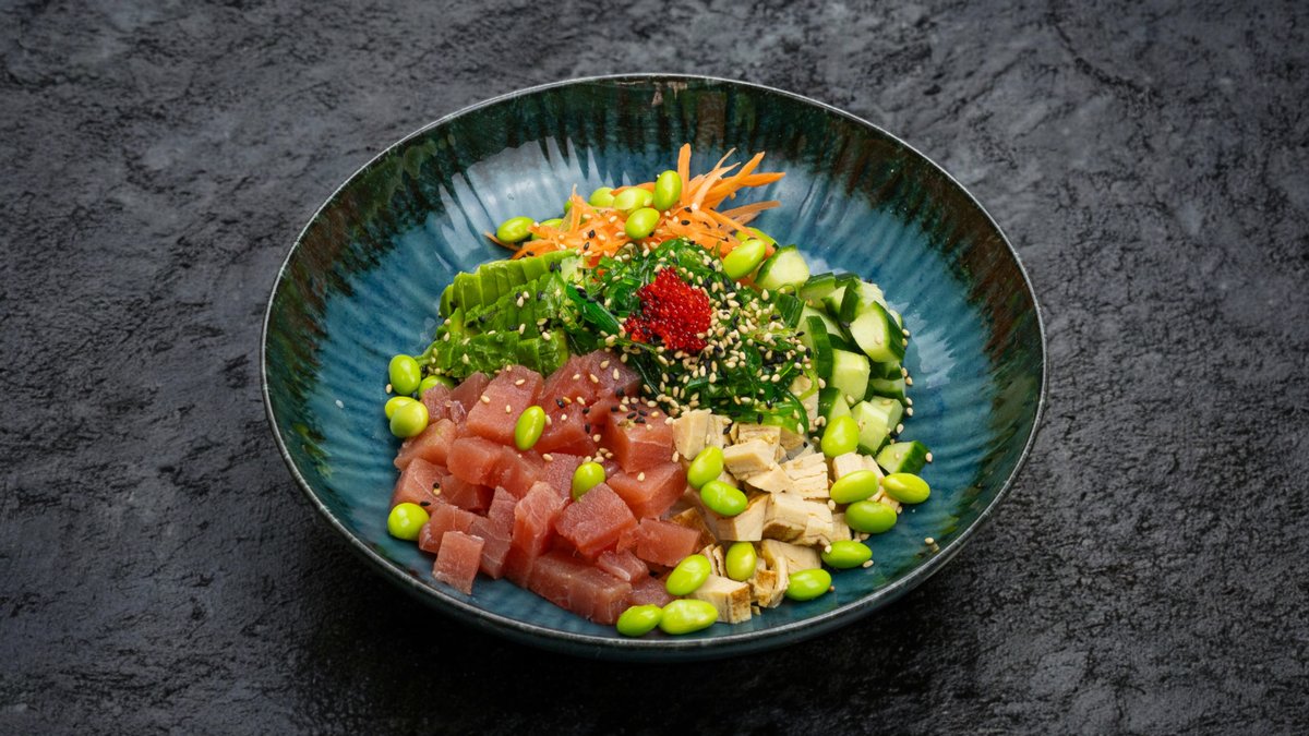 vörös tonhal, edamame bab, avokádó, sárgarépa, uborka, wakame, tamago, jázmin rizs vagy saláta, plusz választható szósz