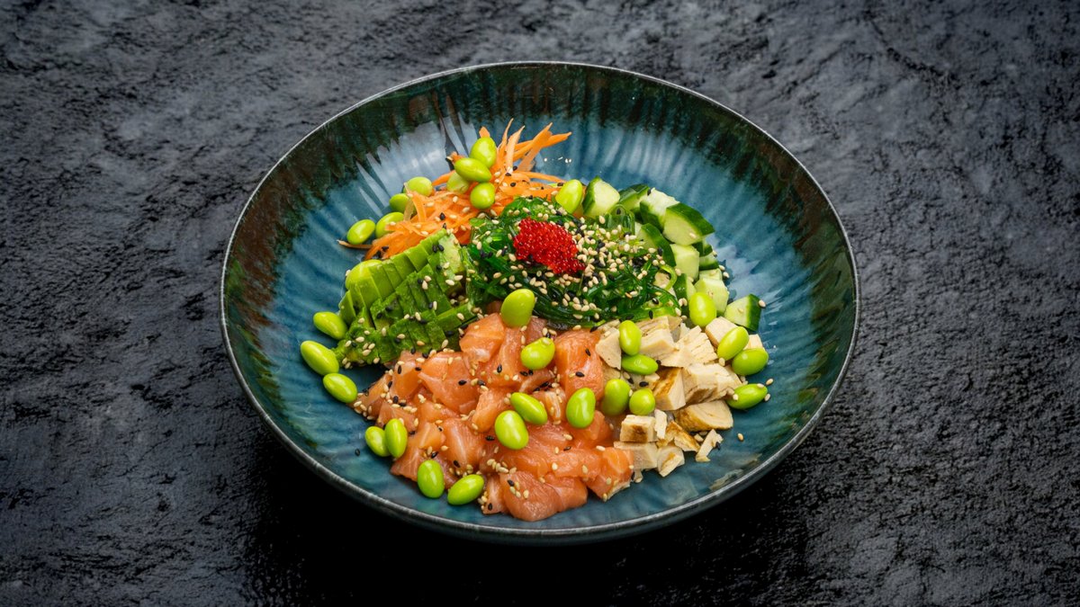 füstölt lazac, edamame bab, avokádó, répa, uborka, wakame, tamago, jázmin rizs vagy saláta, plusz választható szósz